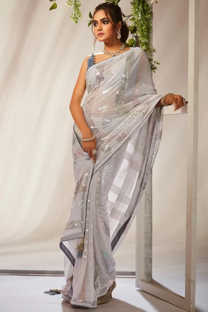 Dark Blue Faux Georgette Sequins Sari Party Wear