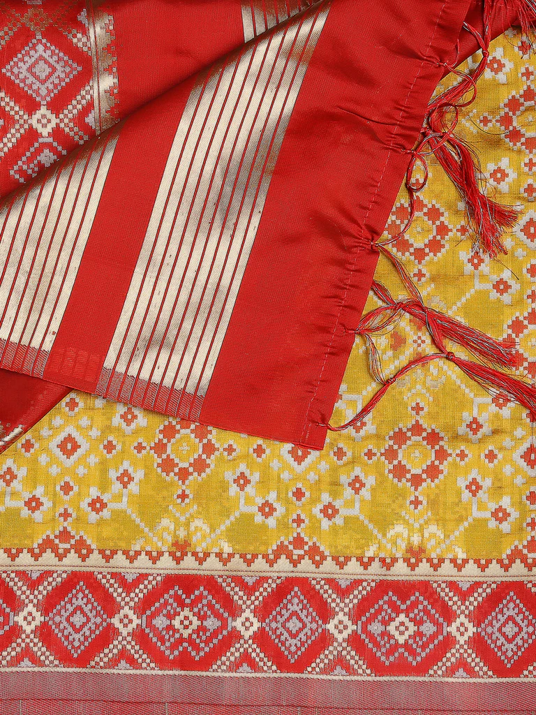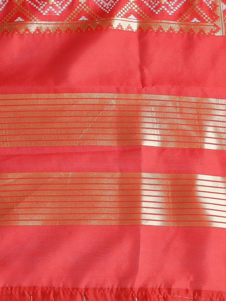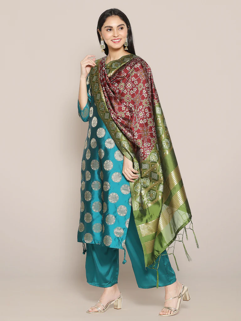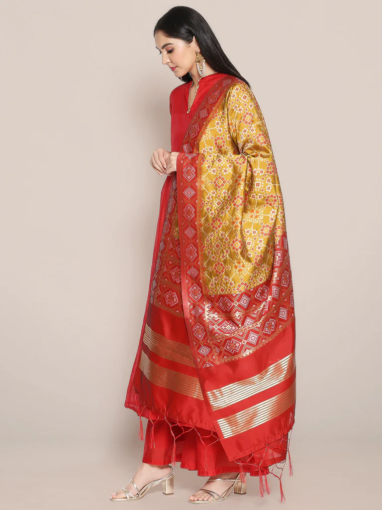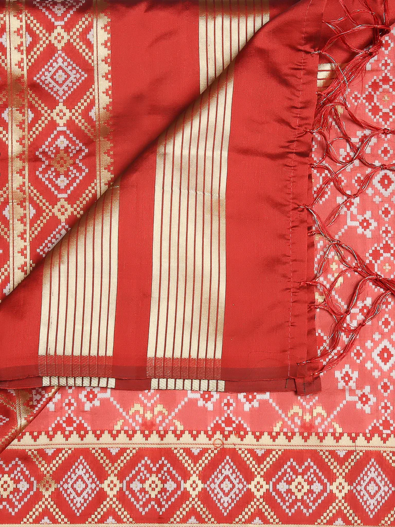 Add a touch of elegance to your wardrobe with this exquisite piece of beautiful Banarasi Silk Dupatta. Swathed with elegant Patola style weaving all over, this classic stunner is a must in your ethnic collection.