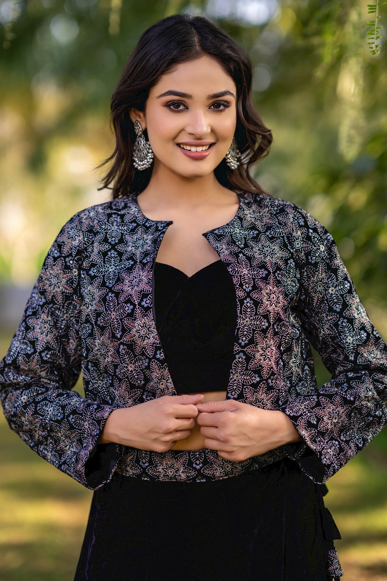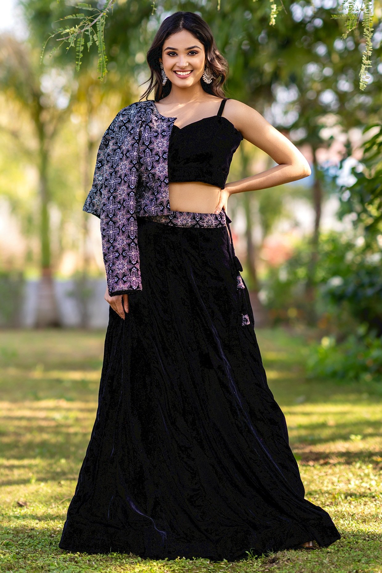 Featuring a black lehenga in velvet base with embellishments. It is paired with a blouse and a jacket. Accentuate it with statement jewellery and heels for a sangeet ceremony.