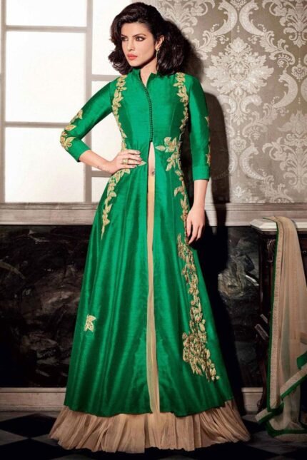 Make the heads turn whenever you dress up in this dark green color georgette saree. This saree is displaying some wonderful work done with embroidered and sequins work look chic. This saree comes with unstiched dark green color georgette blouse.