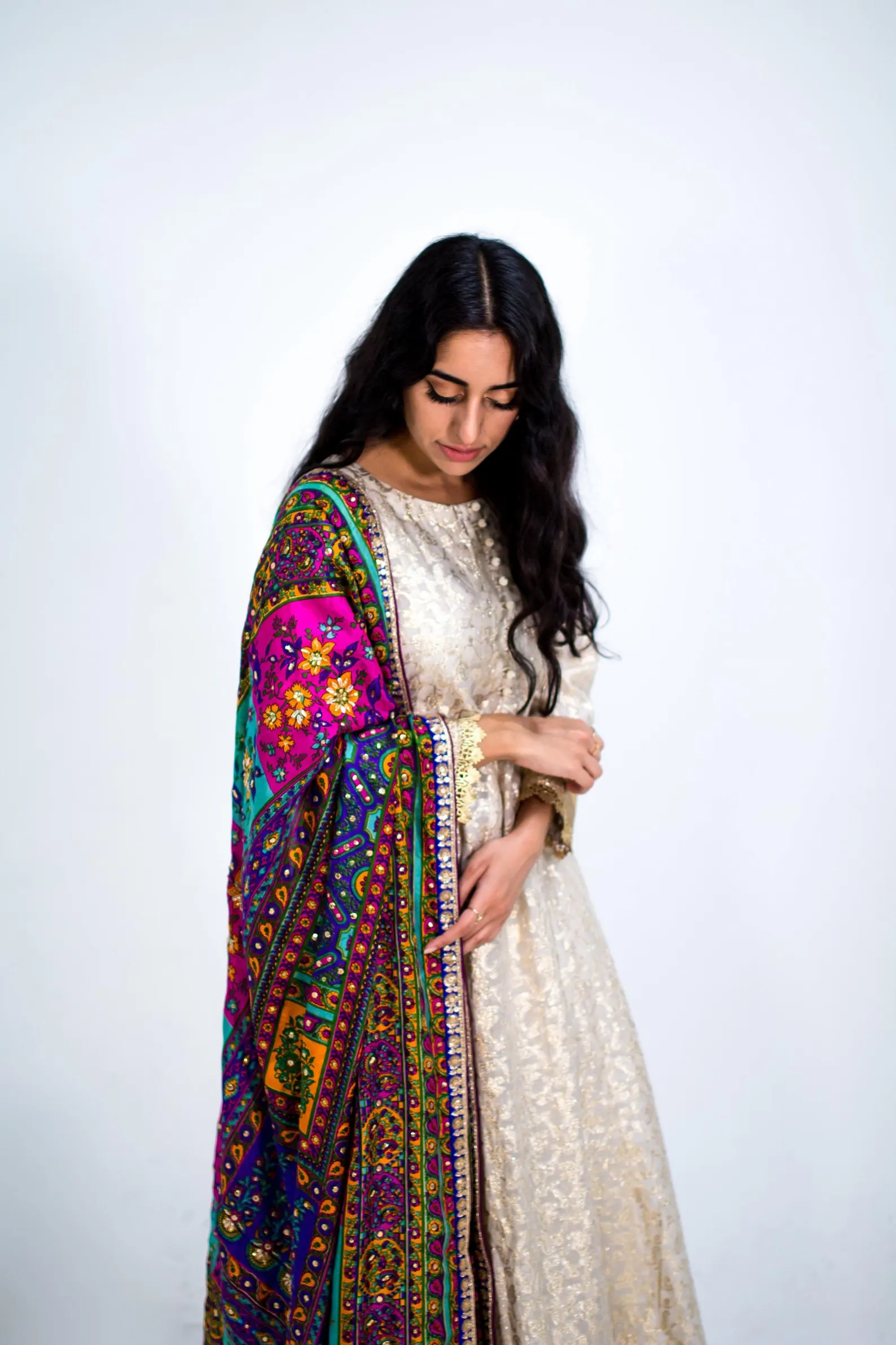 Featuring a grey lehenga in georgette base with thread, mirror, and tassels embroidery. It is paired with a blouse and an organza dupatta. Accentuate with chandbali earrings and heels for a wedding or sangeet ceremony.