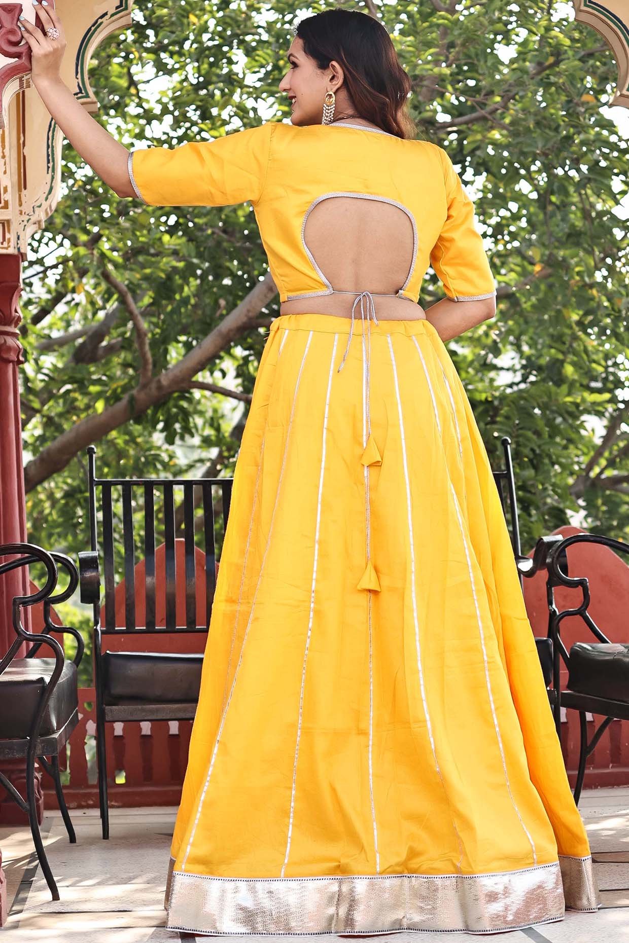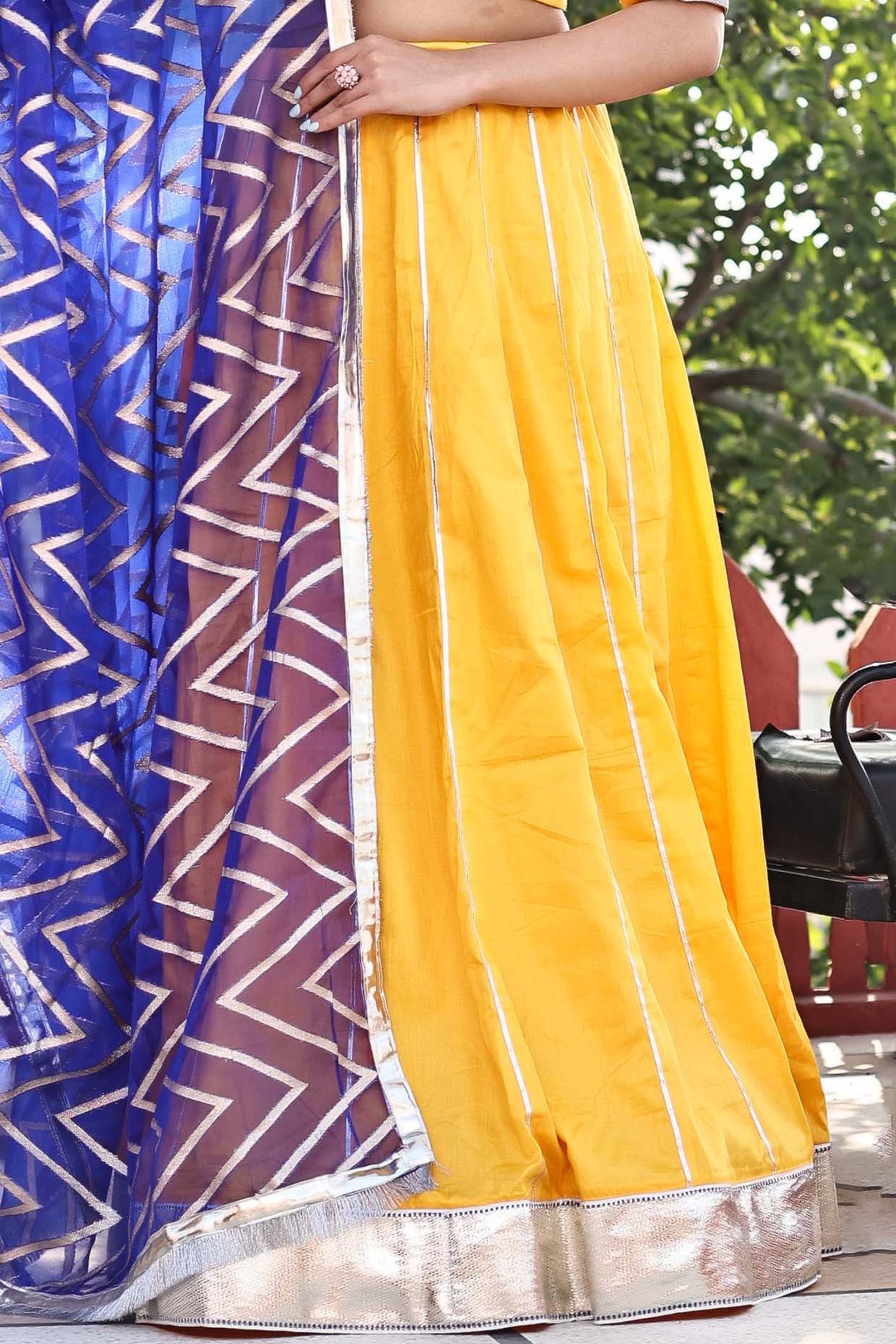 Yellow Cotton Silk Gota Work Kalidar Flared Lehenga Set